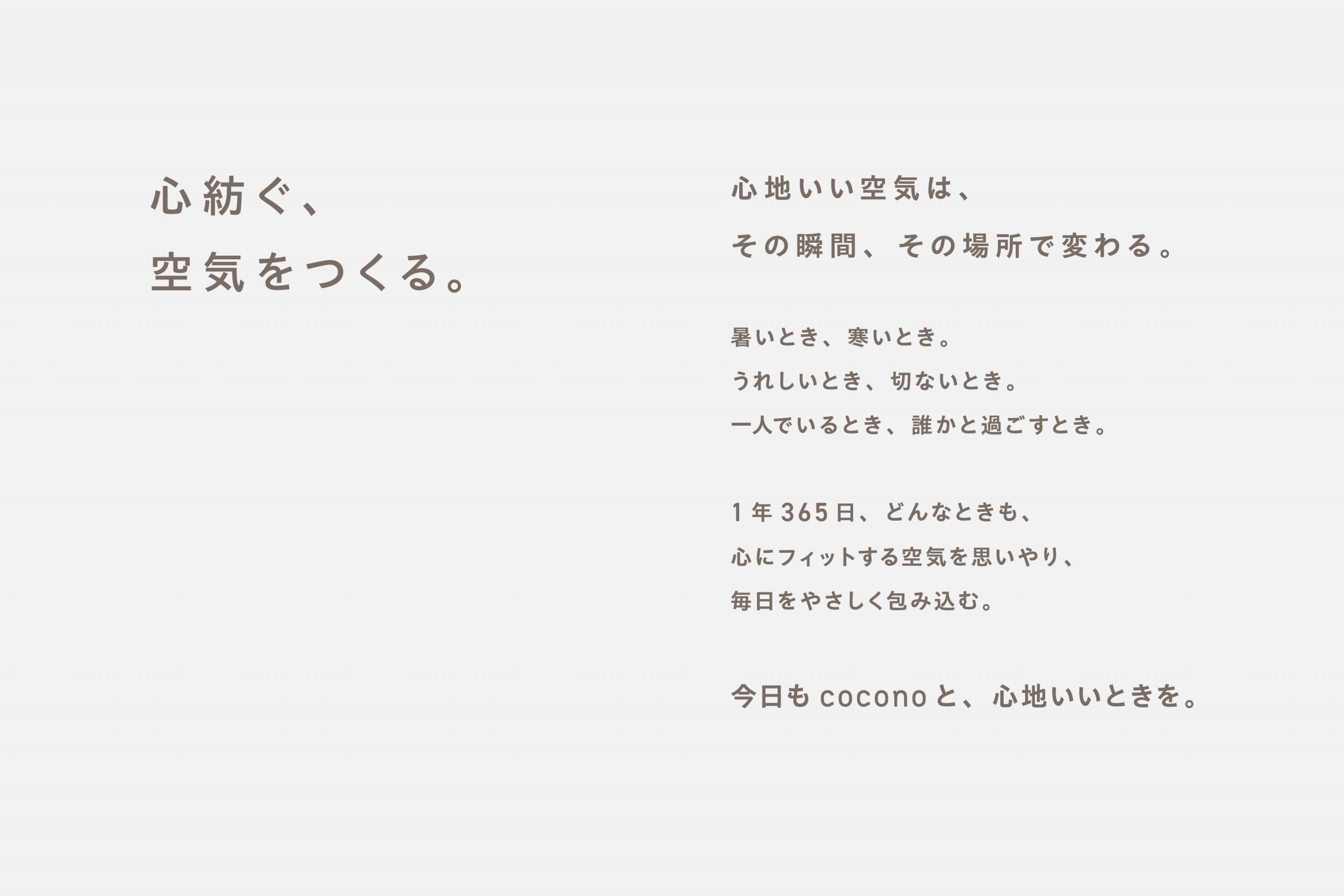 温度や湿度を一定範囲に保ったり、内と外の空気を入れ換えたり…蚕をやさしく包む繭には、空間を心地よく整える機能があります。いろんな人のいろんな一日を心地よく包み込む存在になりたい、そんな願いを込めてcoconoと名付けています。
